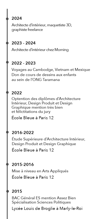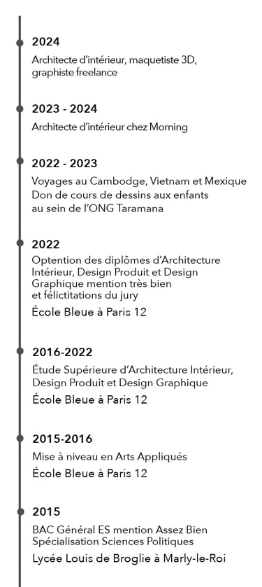 Diplômée de l'école Bleue en 2022, je suis architecte d'intérieur, designer et graphiste. J’aime imaginer des concepts qui m’emportent vers des idées folles et des univers uniques. Mon outil de prédilection est la 3D, ayant une grande expérience de modélisation, j'en ai fait mon activité principale.